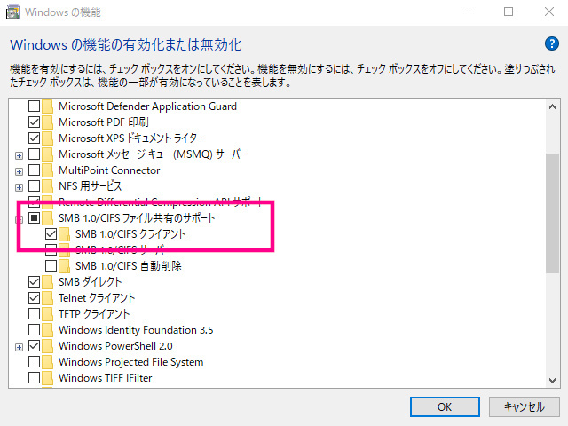 Windows10でSMB1.0を使用するには、